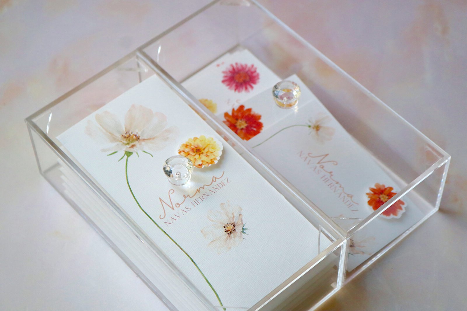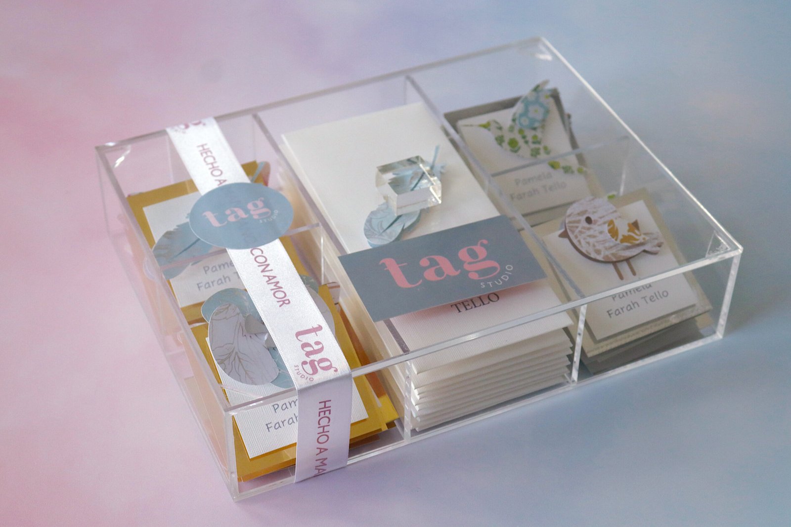 Nos encargamos de hacer tu social stationary único y personalizado, ya sea para ti y tu familia o para cualquier obsequio que tengas con nuestra presentación de cajas de acrílico.