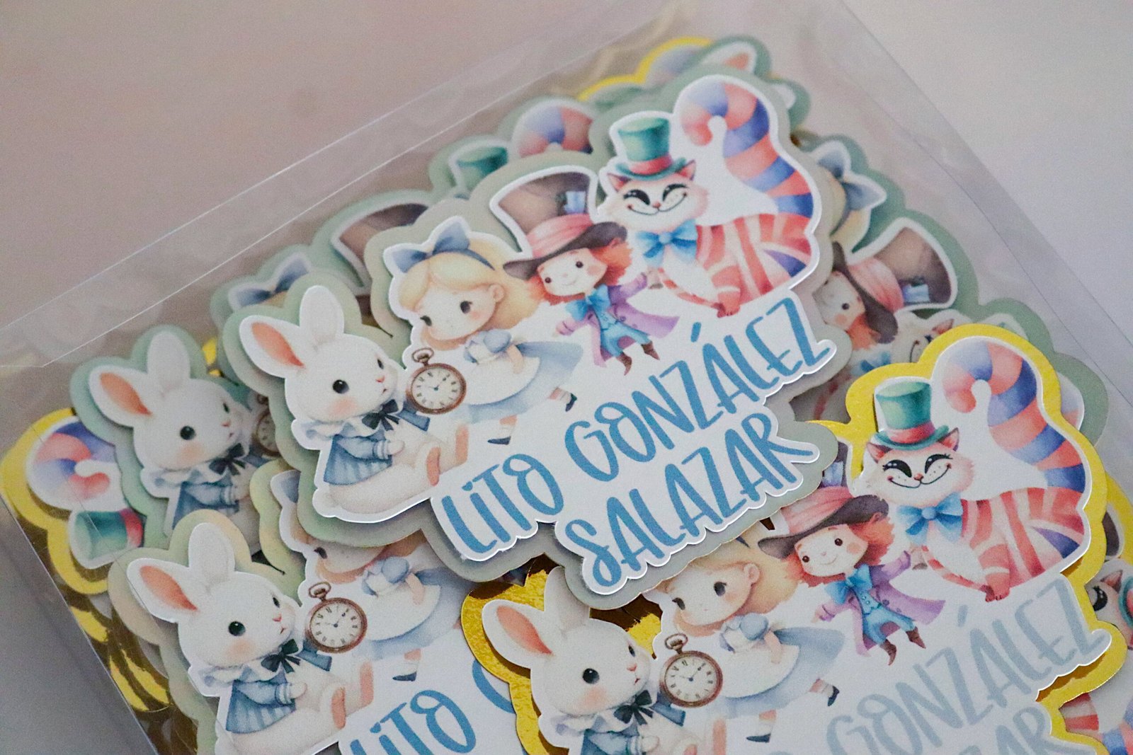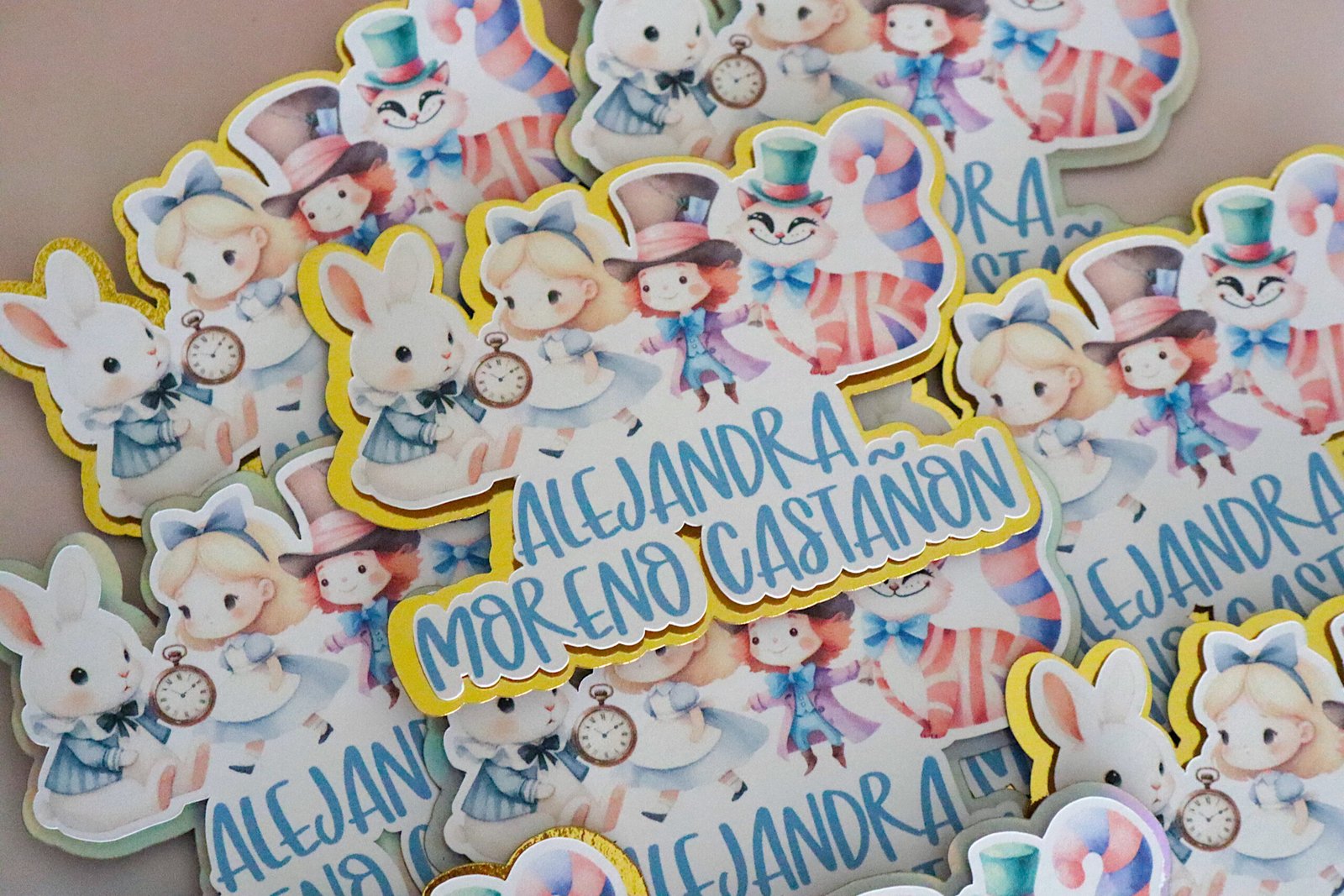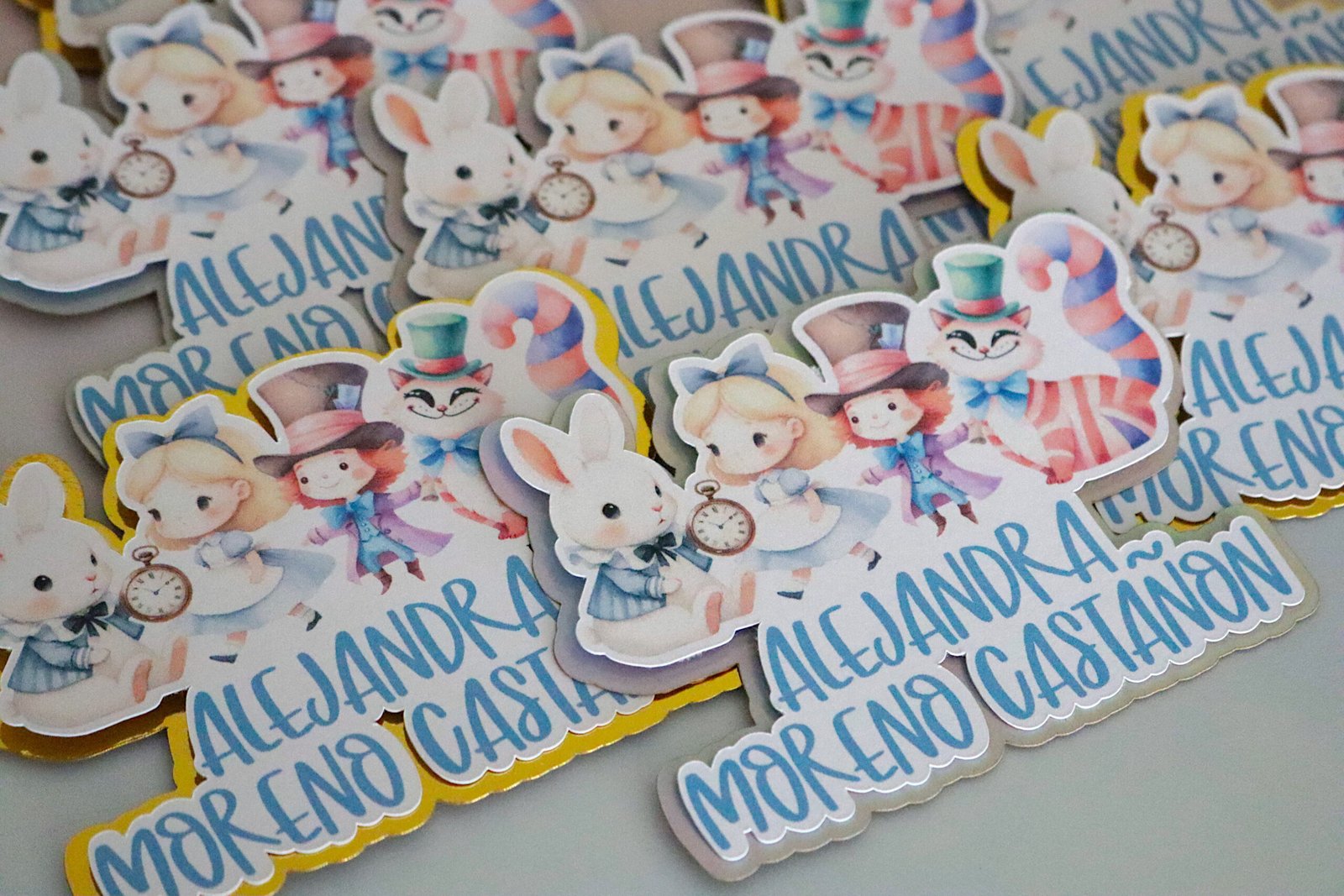 8 Tags de Alicia en el país de las maravillas en relieve con fondo y nombre personalizado, lleva tape doble cara por detrás para pegar directo a los regalos.