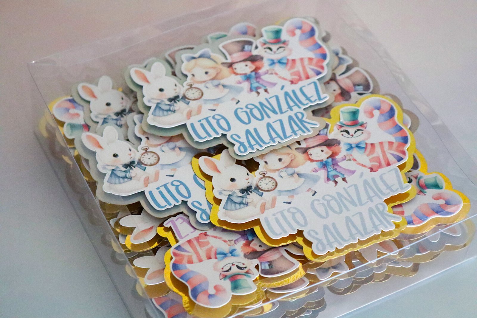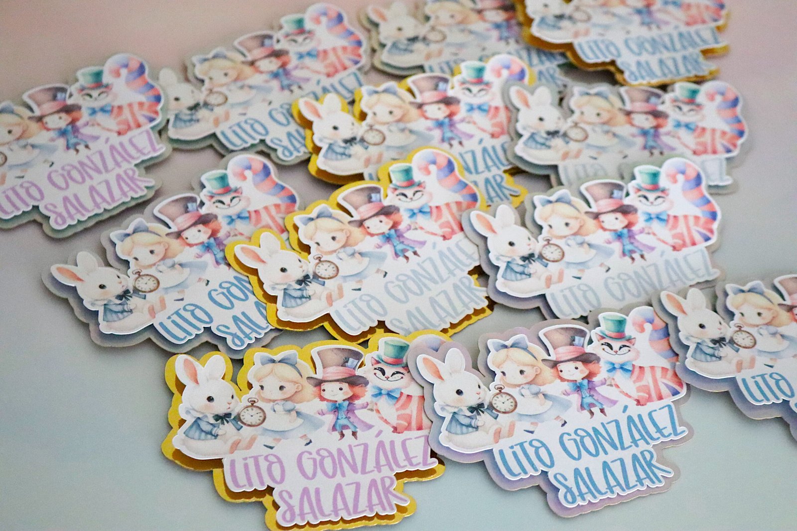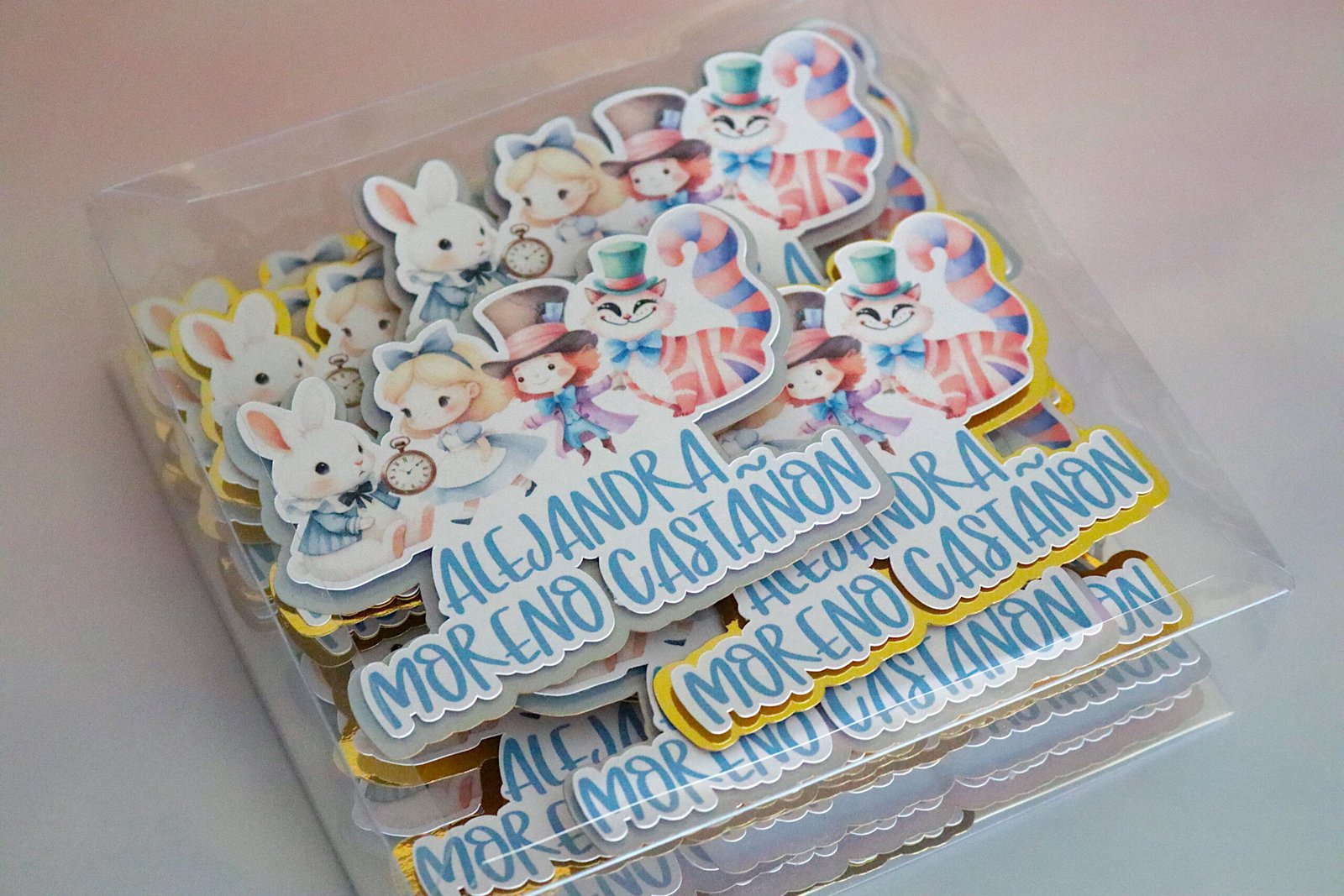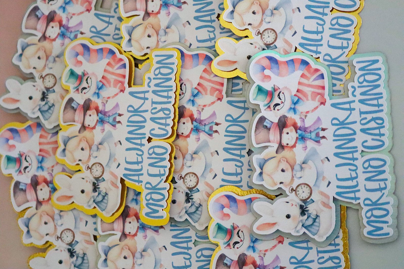8 Tags de Alicia en el país de las maravillas en relieve con fondo y nombre personalizado, lleva tape doble cara por detrás para pegar directo a los regalos.