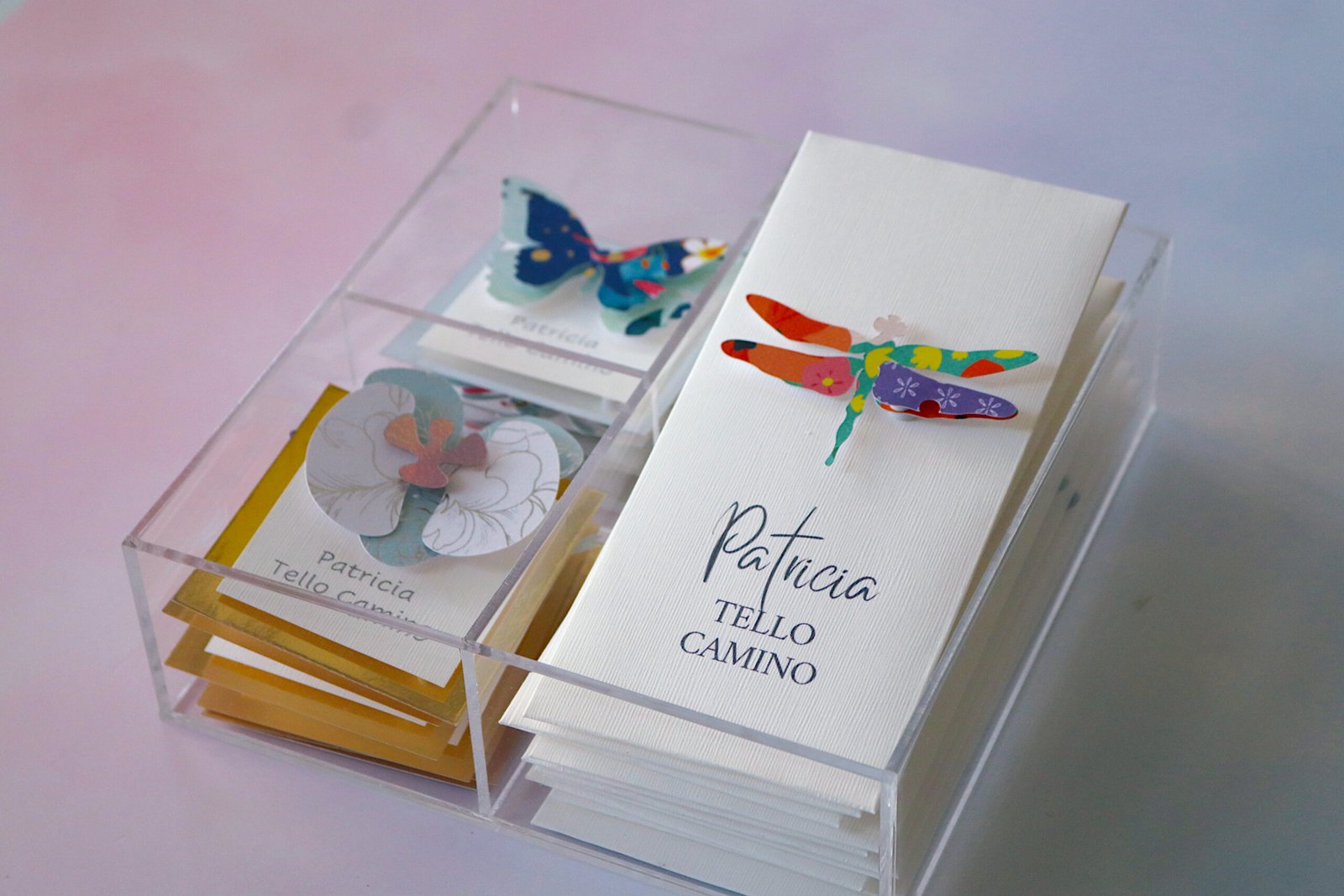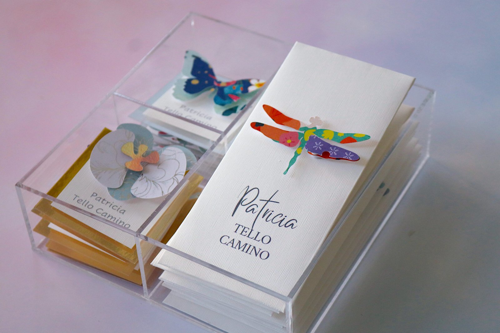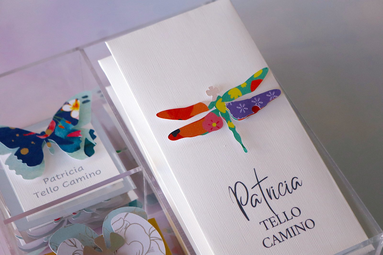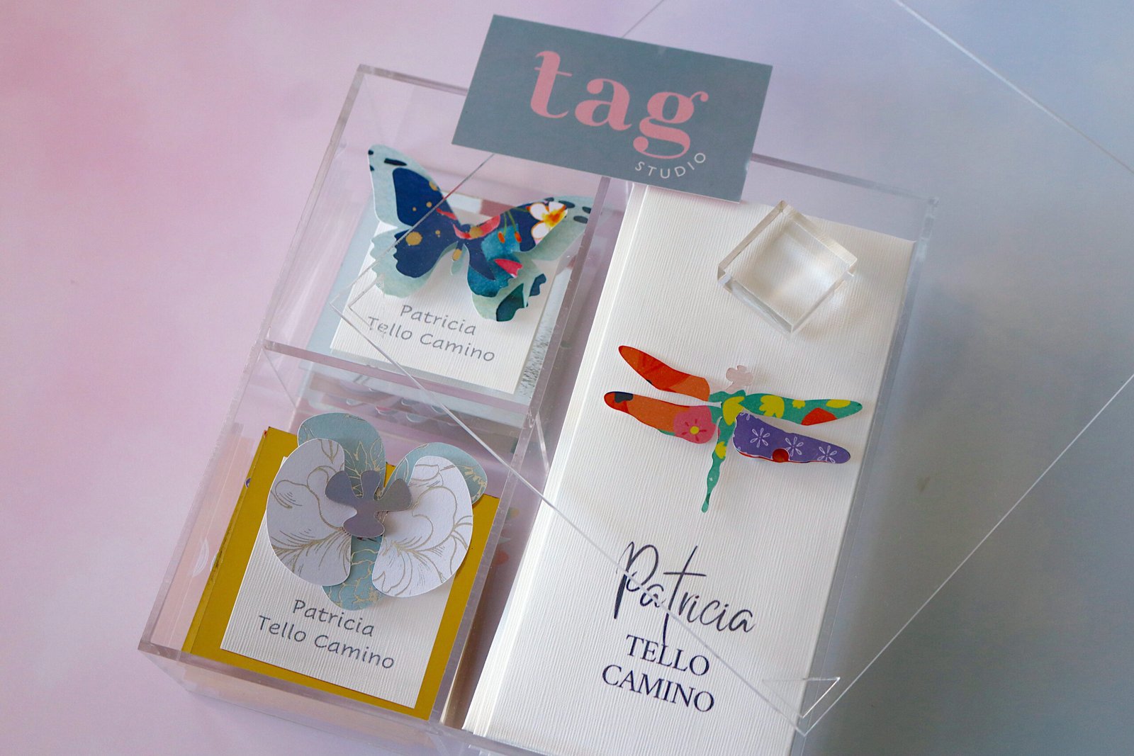 caja de acrilico con 10 sobres para dinero y 12 tags con variado de diseños (mariposa, pluma, búho, libélula, Orquídea y abeja, colibrí, etc)